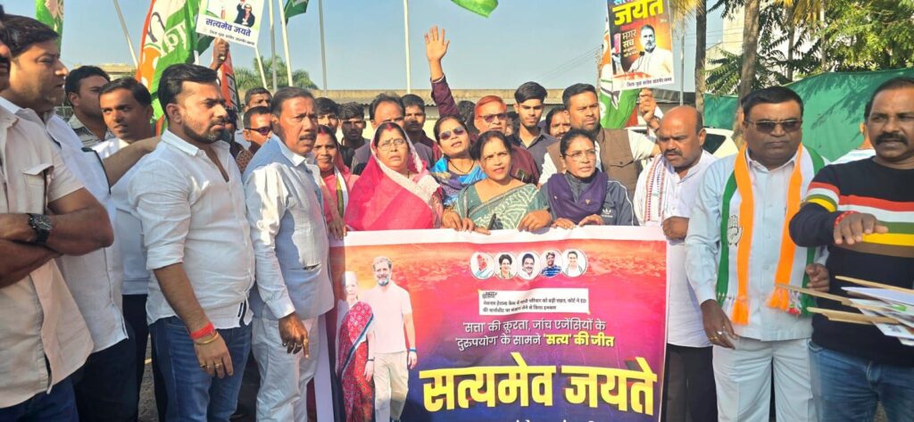 जांजगीर-चांपा। छत्तीसगढ़ प्रदेश कांग्रेस कमेटी के अध्यक्ष दीपक बैज के आह्वान पर नेशनल हेराल्ड प्रकरण में पूर्व राष्ट्रीय अध्यक्ष श्रीमती सोनिया गांधी एवं राहुल गांधी को न्यायालय, नई दिल्ली द्वारा क्लीन चिट दिए जाने के उपरांत जिला कांग्रेस कमेटी एवं जिला युवा कांग्रेस जांजगीर-चांपा के संयुक्त तत्वावधान में खोखसा फाटक स्थित भारतीय जनता पार्टी के जांजगीर कार्यालय का घेराव किया गया।