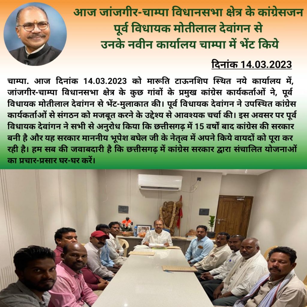 मारूति टाऊनशिप स्थित नये कार्यालय में, जांजगीर-चाम्पा विधानसभा क्षेत्र के कुछ गांवों के प्रमुख कांग्रेस कार्यकर्ताओं ने, पूर्व विधायक मोतीलाल देवांगन से भेंट-मुलाकात की। पूर्व विधायक देवांगन ने उपस्थित कांग्रेस कार्यकर्ताओं से संगठन को मजबूत करने के उद्देश्य से आवश्यक चर्चा की। इस अवसर पर पूर्व विधायक देवांगन ने सभी से अनुरोध किया कि छत्तीसगढ़ में 15 वर्षों बाद कांग्रेस की सरकार
