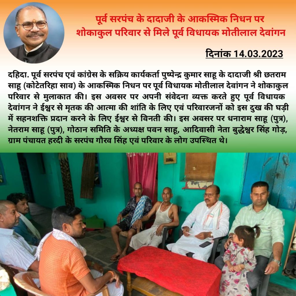 पूर्व सरपंच एवं कांग्रेस के सक्रिय कार्यकर्ता पुष्पेन्द्र कुमार साहू के दादाजी छतराम साहू (कोटेतरिहा साव) के आकस्मिक निधन पर पूर्व विधायक मोतीलाल देवांगन ने शोकाकुल परिवार से मुलाकात की। इस अवसर पर अपनी संवेदना व्यक्त करते हुए पूर्व विधायक देवांगन ने ईश्वर से मृतक की आत्मा की शांति के लिए एवं परिवारजनों को इस दुख की घड़ी में सहनशक्ति प्रदान करने के लिए ईश्वर से विनती की। इस अवसर पर धनाराम साहू (पुत्र), नेतराम साहू (पुत्र), गोठान समिति के अध्यक्ष पवन साहू, आदिवासी नेता बुद्धेश्वर सिंह गोड़, ग्राम पंचायत हरदी के सरपंच गौरव सिंह एवं परिवार के लोग उपस्थित थे।