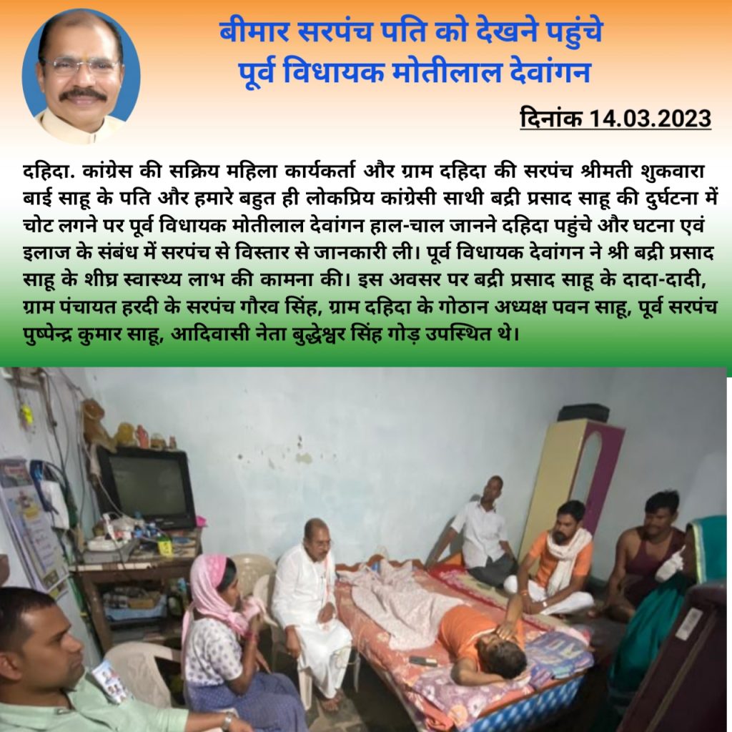 कांग्रेस की सक्रिय महिला कार्यकर्ता और ग्राम दहिदा की सरपंच श्रीमती शुकवारा बाई साहू के पति और हमारे बहुत ही लोकप्रिय कांग्रेसी साथी बद्री प्रसाद साहू की दुर्घटना में चोट लगने पर पूर्व विधायक मोतीलाल देवांगन हाल-चाल जानने दहिदा पहुंचे और घटना एवं इलाज के संबंध में सरपंच से विस्तार से जानकारी ली। पूर्व विधायक देवांगन ने बद्री प्रसाद साहू के शीघ्र स्वास्थ्य लाभ की कामना की। इस अवसर पर बद्री प्रसाद साहू के दादा-दादी, ग्राम पंचायत हरदी के सरपंच गौरव सिंह, ग्राम दहिदा के गोठान अध्यक्ष पवन साहू, पूर्व सरपंच पुष्पेन्द्र कुमार साहू, आदिवासी नेता बुद्धेश्वर सिंह गोड़ उपस्थित थे।